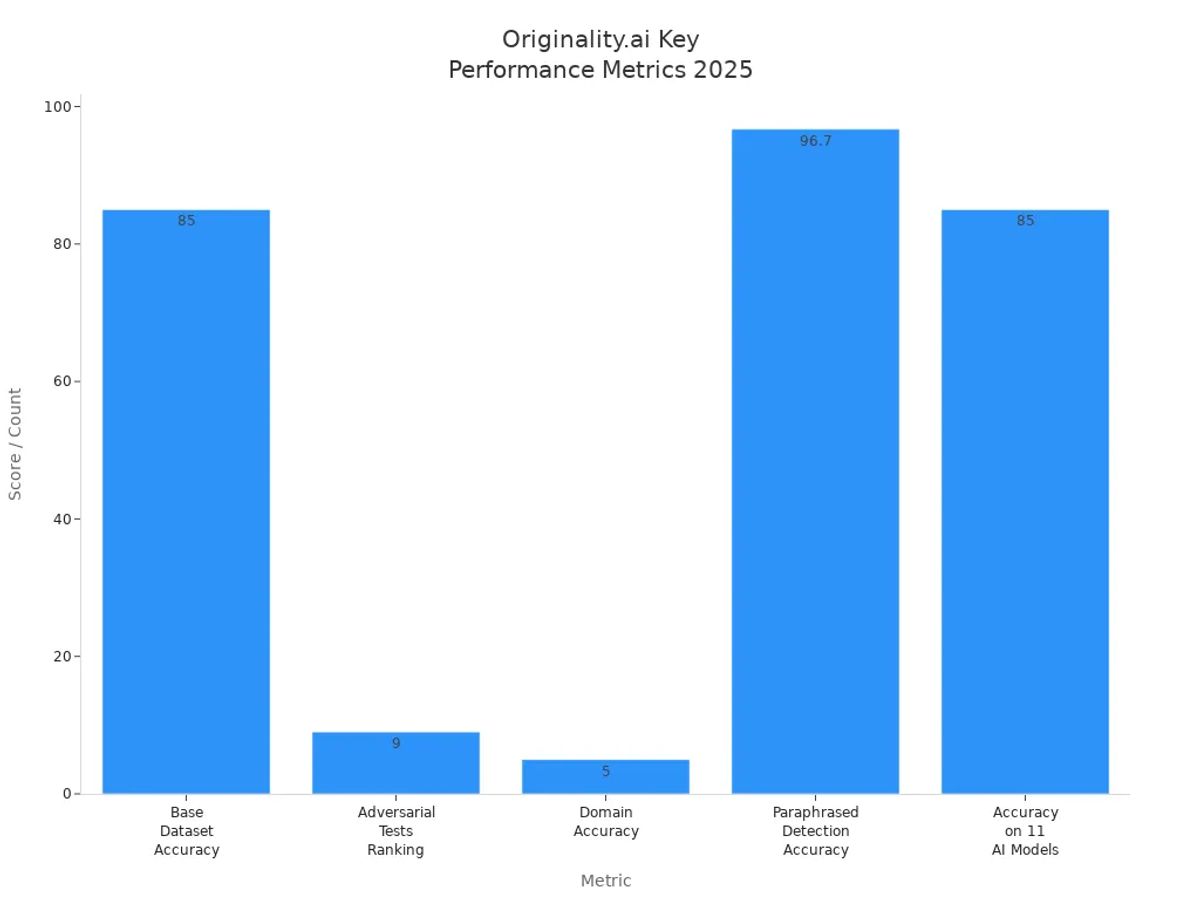 When you compare top ai language detectors, you see big differences in how well they work. Originality.ai does better than 11 other tools on the RAID test. It got 85% accuracy on a huge set of over 6 million texts . For paraphrased AI writing, it reached 96.7% accuracy. It was the best in most tough tests and types of content. In medical summaries, Originality.ai had 100% sensitivity and 95% specificity, with an AUC of 97.6% . Studies show that Originality.ai, Sapling, and Copyleaks are all very accurate and make few mistakes . These results show why strong content checks are important, especially for both simple and hard scans.