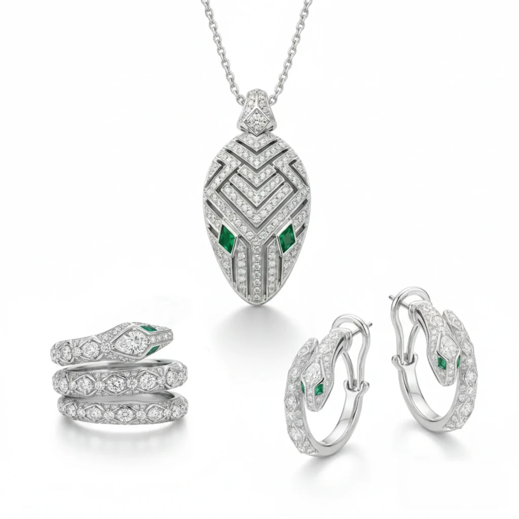 Each piece in the collection—from the cascading necklace to the crowned earrings and statement ring—tells a story of excellence, prosperity, and sophisticated taste. For those who appreciate the finest things in life, the Valiant Serpent collection offers not just jewelry, but wearable art that will be treasured for generations.