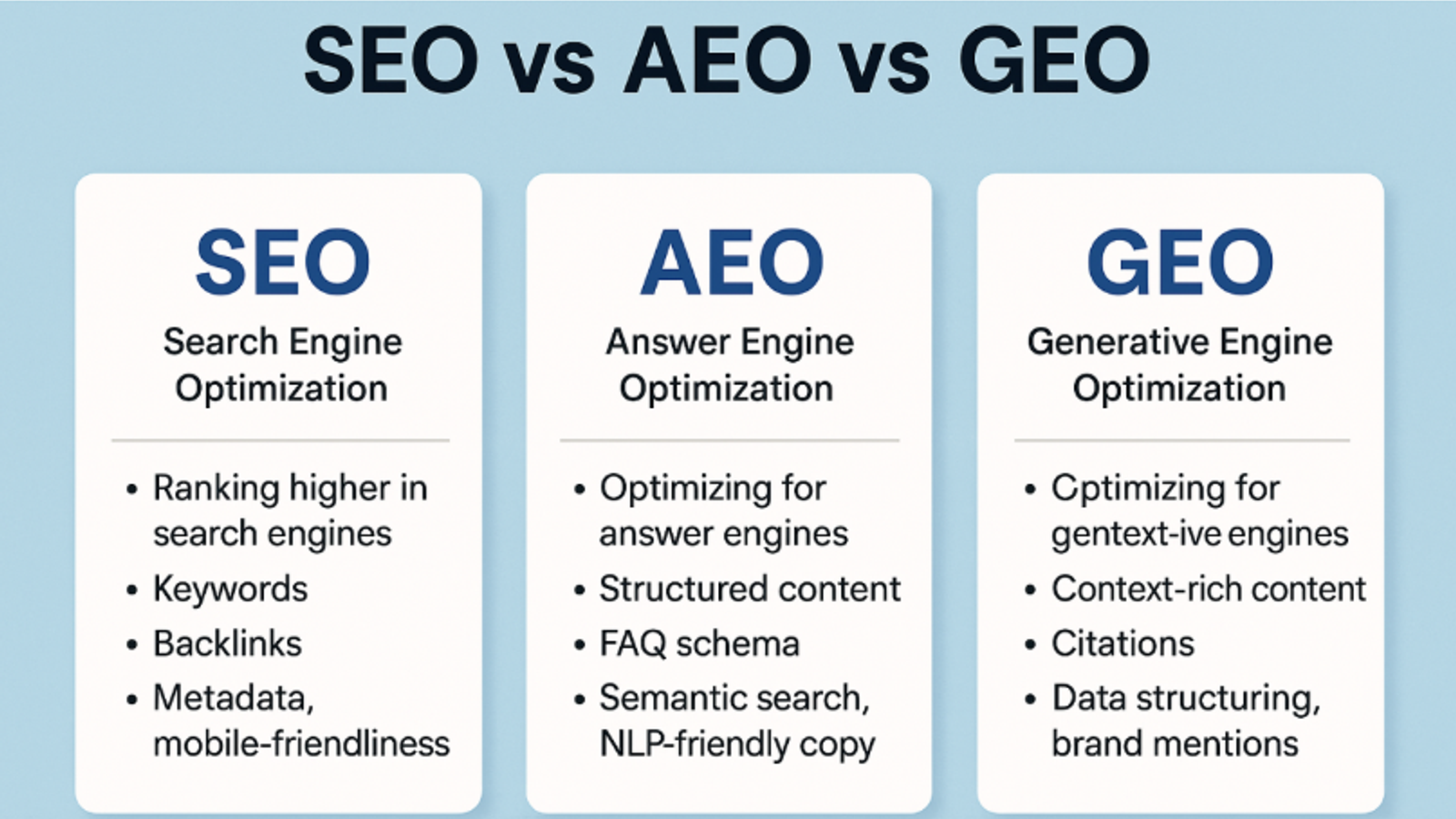SEO Relevance: SEO captures bottom-funnel searches and long-tail technical queries. Balance: 60% GEO, 40% SEO.